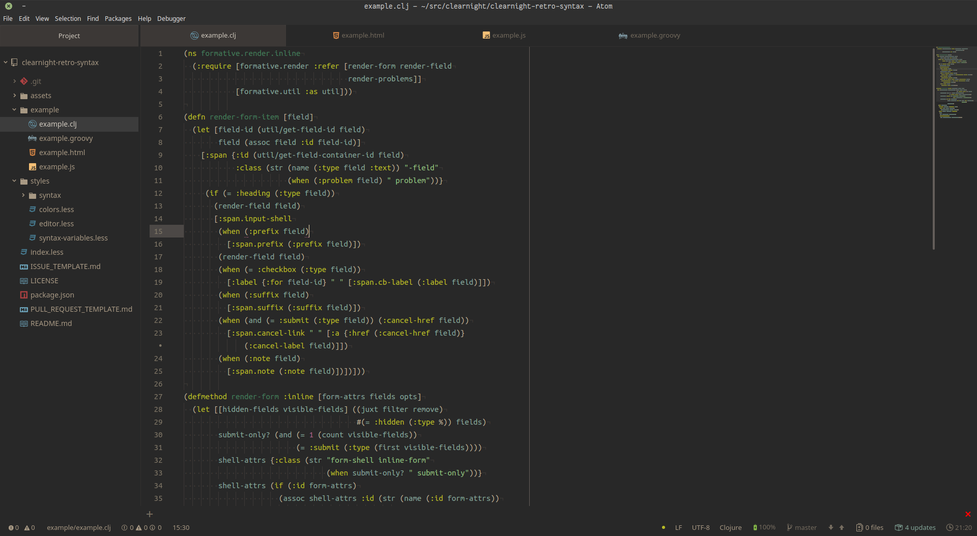 The core of the theme is forked from Clear Night, and makes use of a relaxed, almost faded color scheme inspired by Gruvbox. The theme set will continue to be maintained by me and the ClearNight organization. I'm no longer using Atom much, I've been leaning more into my configuration of Emacs recently, but the ClearNight themese will continue to receive full support for at least a few years.