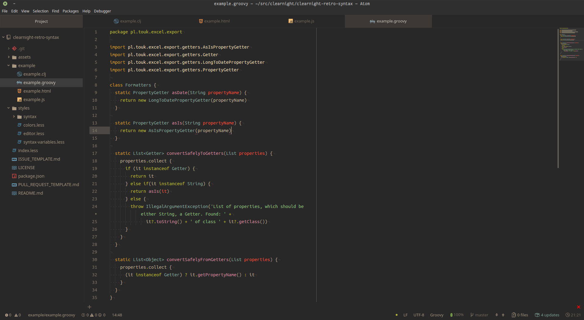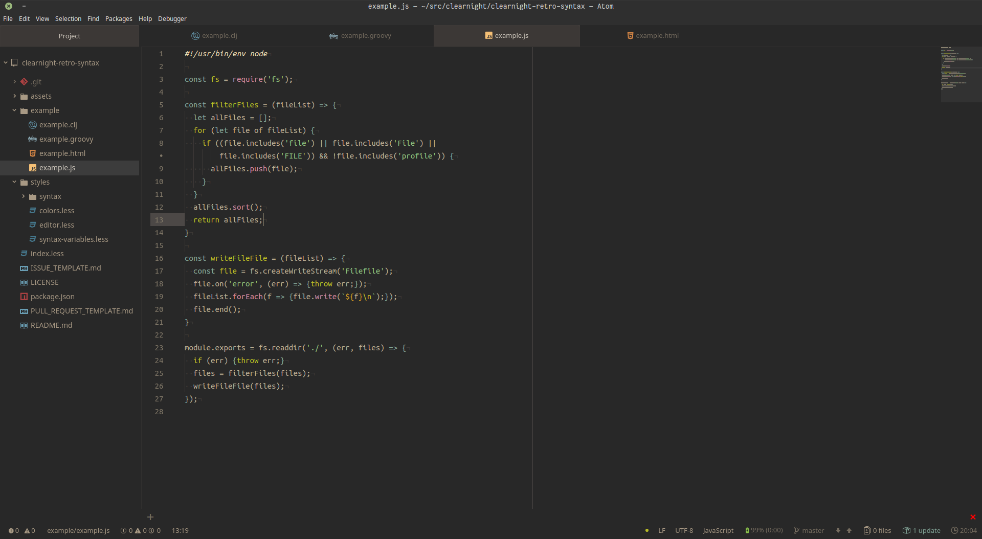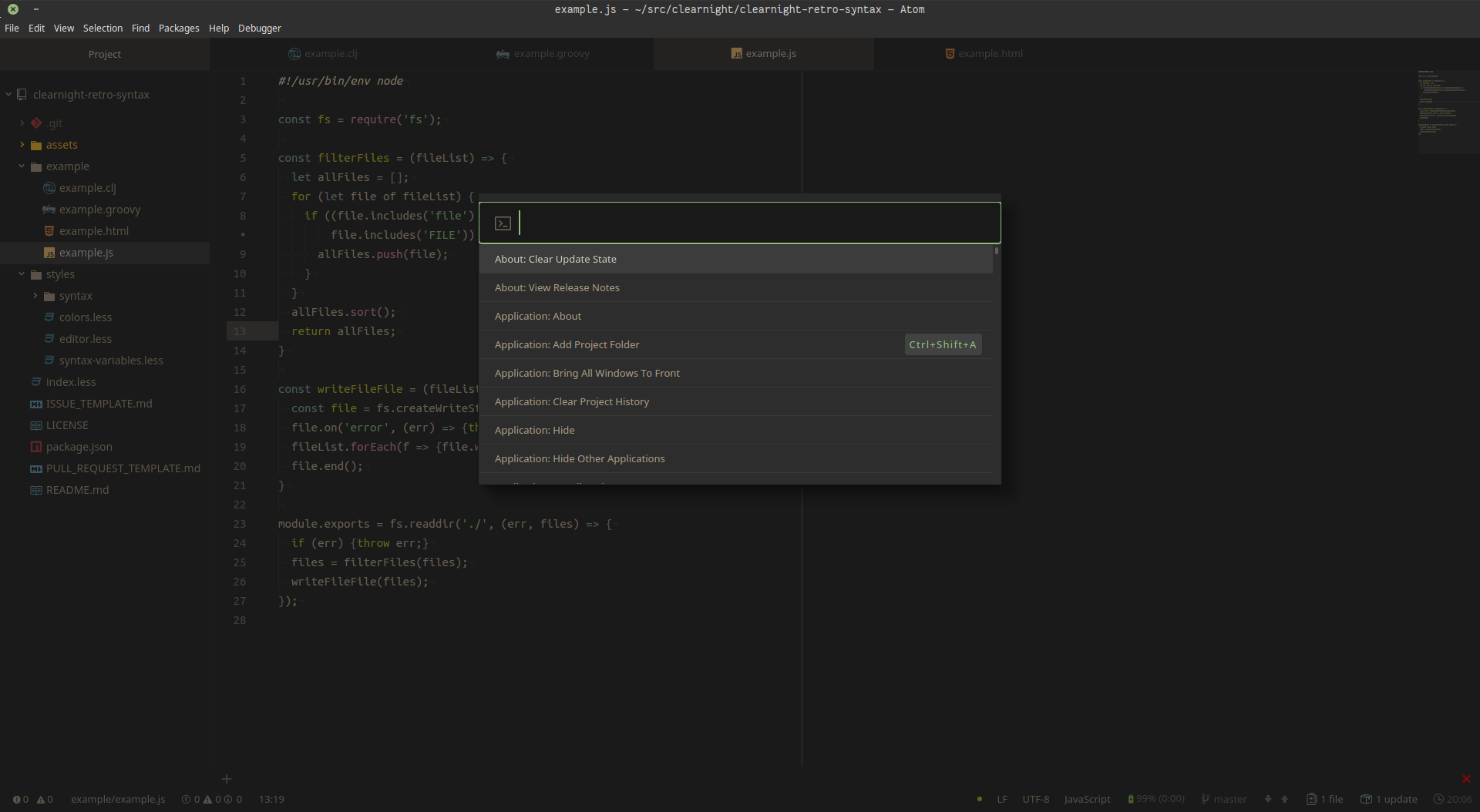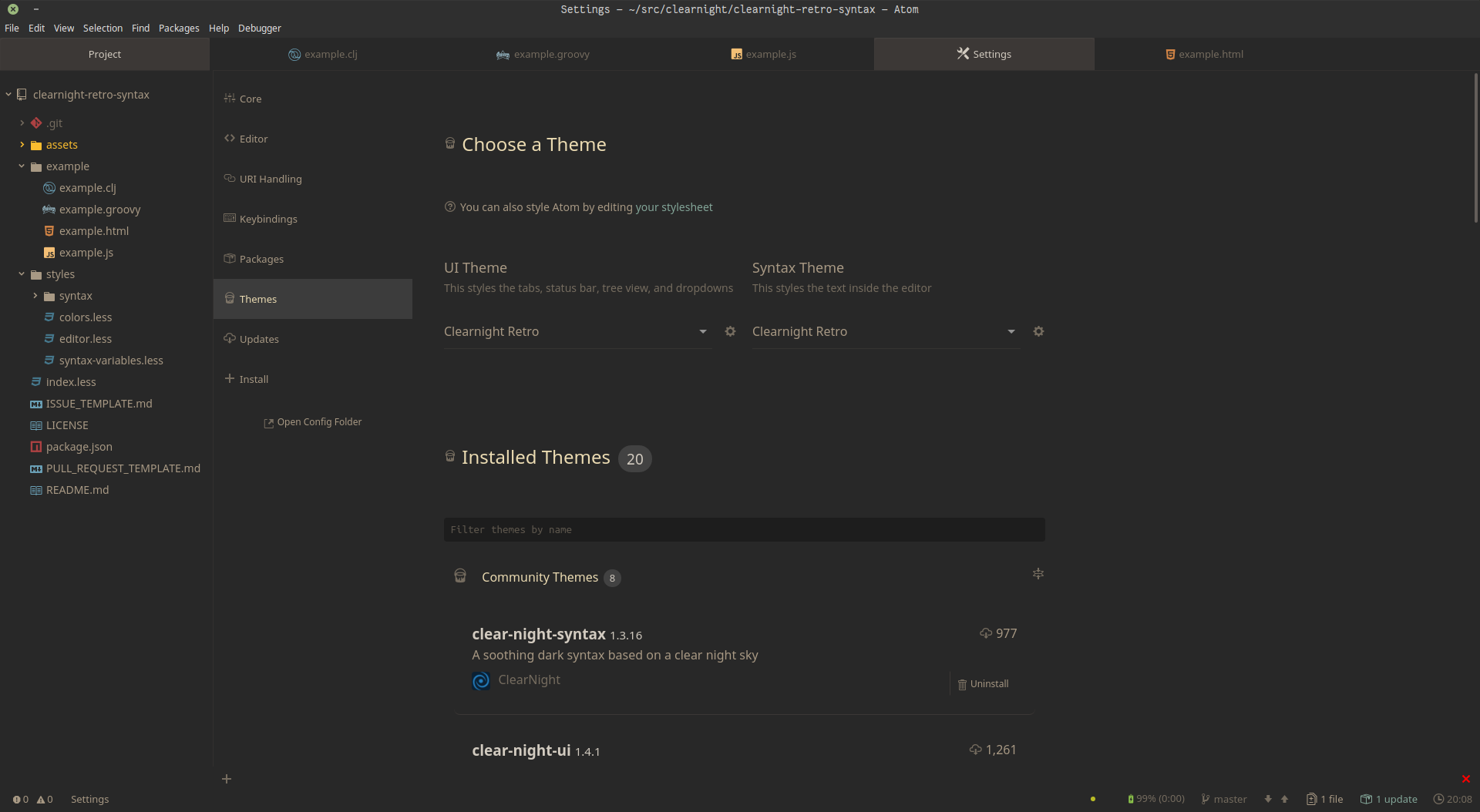 After a bit of work, I'm proud to introduce ClearNight Retro, a new dark, relaxed retro theme for Atom! The set is a UI theme with matching syntax theme, but both can work separately with other dark themes like Atom's own One Dark.